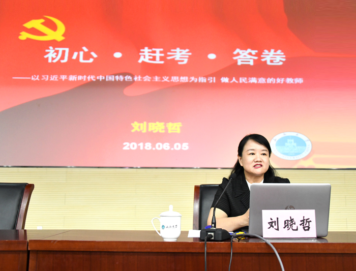 刘晓哲以《初心·赶考·答卷------以习近平新时代中国特色社会主义思想为指引,做人民满意的教师》为题,强调了以中国共产党人的初心和历史使命入手,用丰富的案例生动解读了习近平新时代中国特色社会主义思想蕴含的深刻的人民至上理念,学习贯彻习近平总书记以人民为中心的思想,把人民对美好生活的向往作为我们党的奋斗目标的执政理念。以此为指导,深入学习习近平总书记2018年5月2日视察北京大学在师生座谈会上的讲话精神,提出做新时代“四有”好教师的奋斗目标。